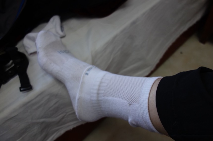 穿上昨天自製的腳踝襪,這次沒有穿好,下面的襪子應該要套在腳踝襪上,這樣腳踝的部分才不會往上捲動而位置跑掉。