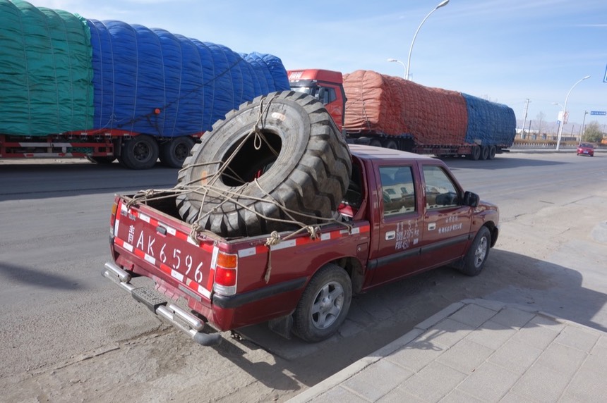 第二輛是小貨卡,後面車斗綁了一個超大的卡車輪胎。