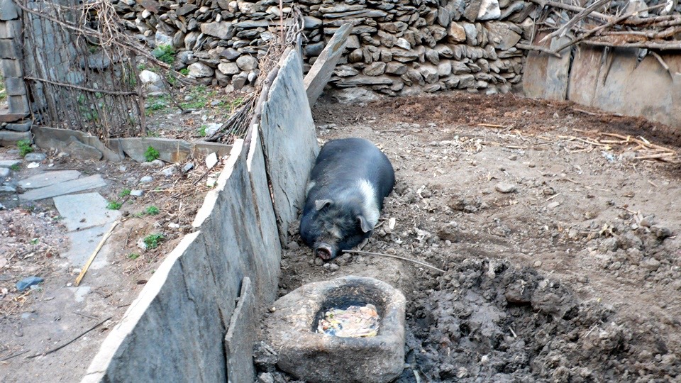 Next to the latrine there’s a big black pig and it was still sleeping.