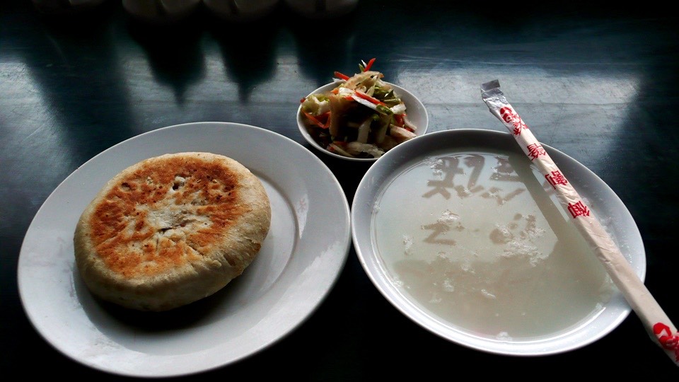 So she gave me a big bowl of congee, a Chinese pancake and some salty pickled vegetables.