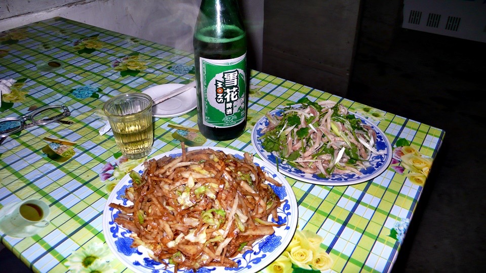 I ordered a stir fry pancake (3 bucks), strips of pork ear (8 bucks) and a Snow Flake beer (3 bucks).