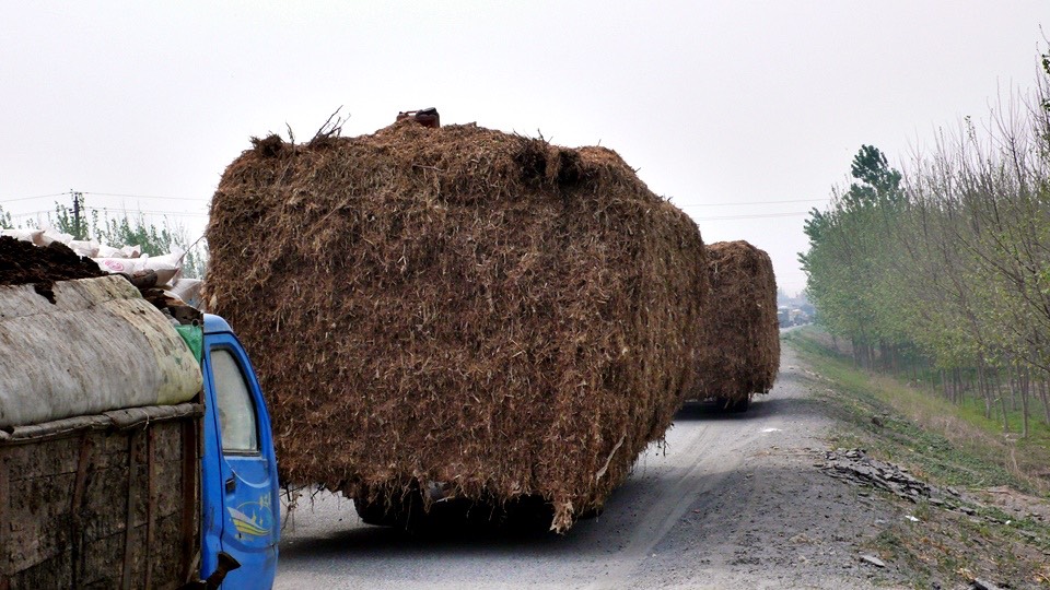 Some tractors carried a huge pile of hays. From the back you can only see a stack of hays moving. Very funny.