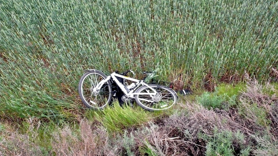 I carefully slid down to the wheat field, removed the front bags, and hauled Dido and myself back to the roadway.