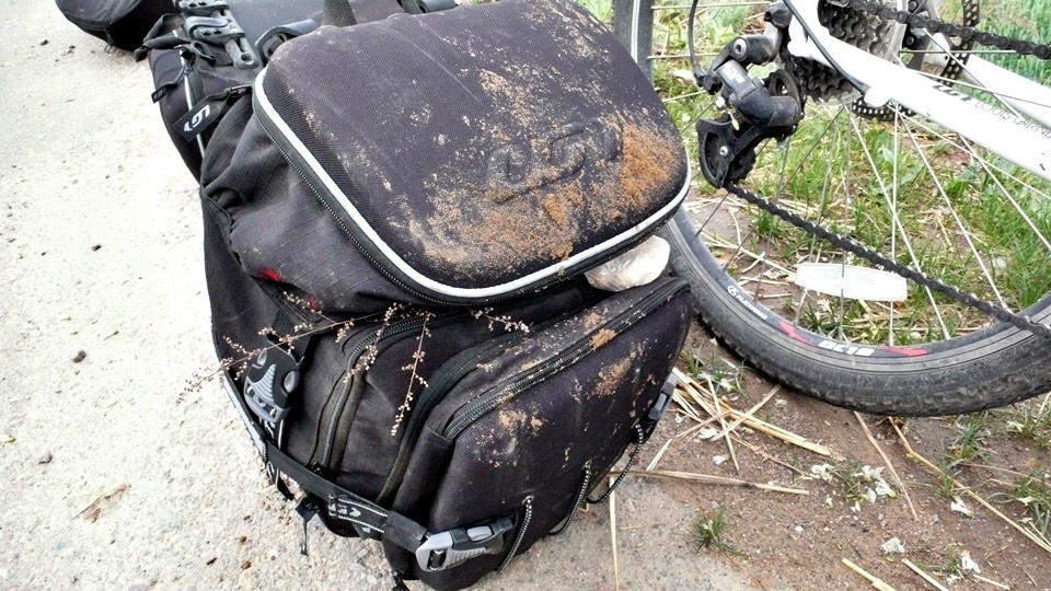 My poor Dido and the front bags fell down to the wheat field, 3 meters below the roadway.