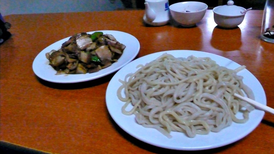 My dinner were twice cooked pork, noodle, and egg soup, half way through dinner,