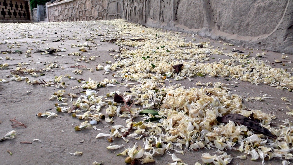 I walk down from the hill and the wind blowing some unknown leaves and petals all around.