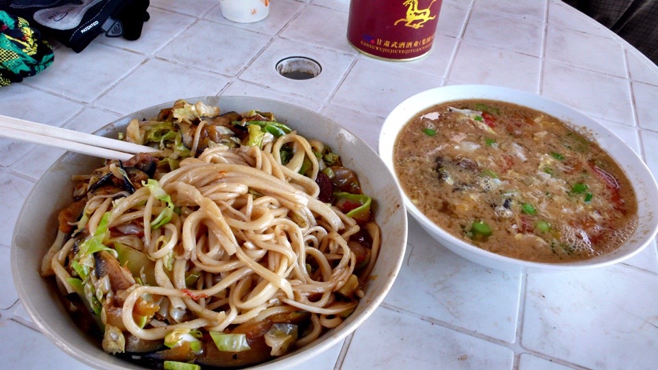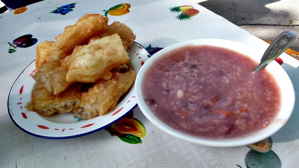 On the way out of Wuwei, I had eight-treasure porridge and two tasty deep-fried Chinese doughnuts for breakfast.