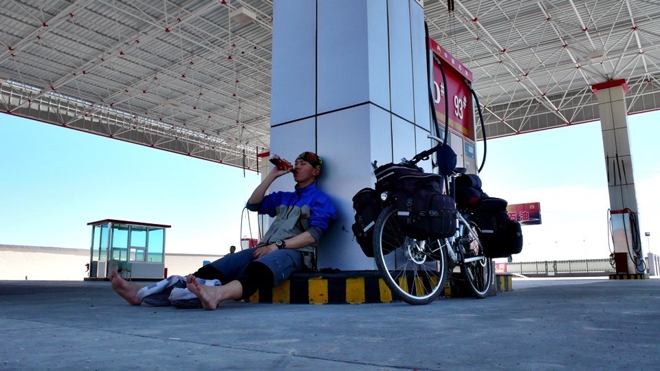 I took off the shoes and socks, sat next to the gas pump to have my lunch—a can of coke and a couple of crackers