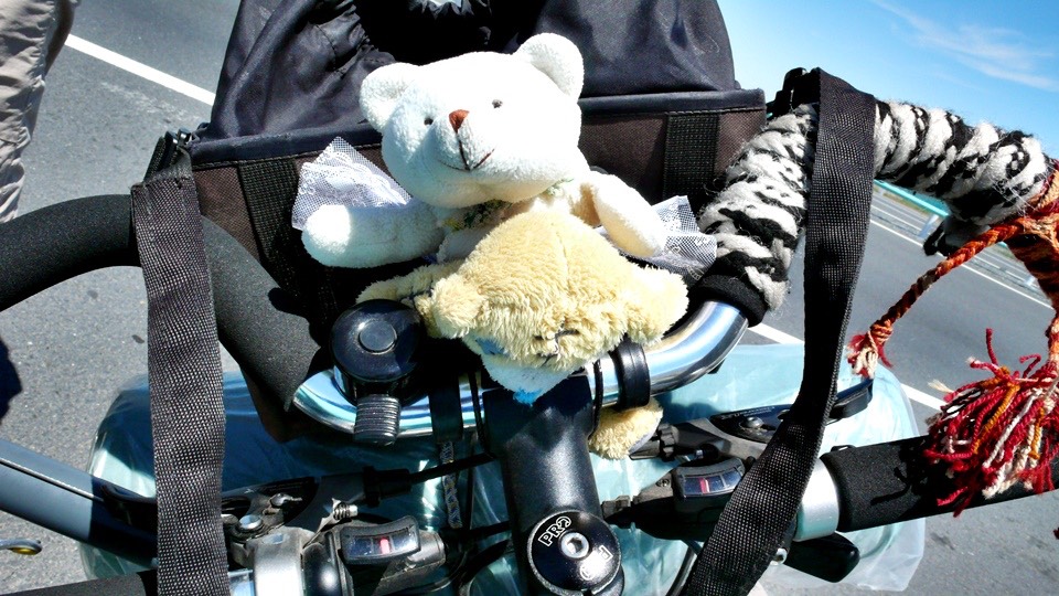 Their bikes were very “cute”: both of them had puppets on their bike handles. Jacquin has a giraffe, and Fleck has two bears.
