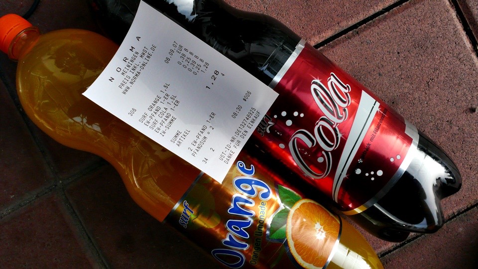 I picked out a bottle each of cola and orange soda, I calculated two bottles being $0.78Euro ($1.17USD),