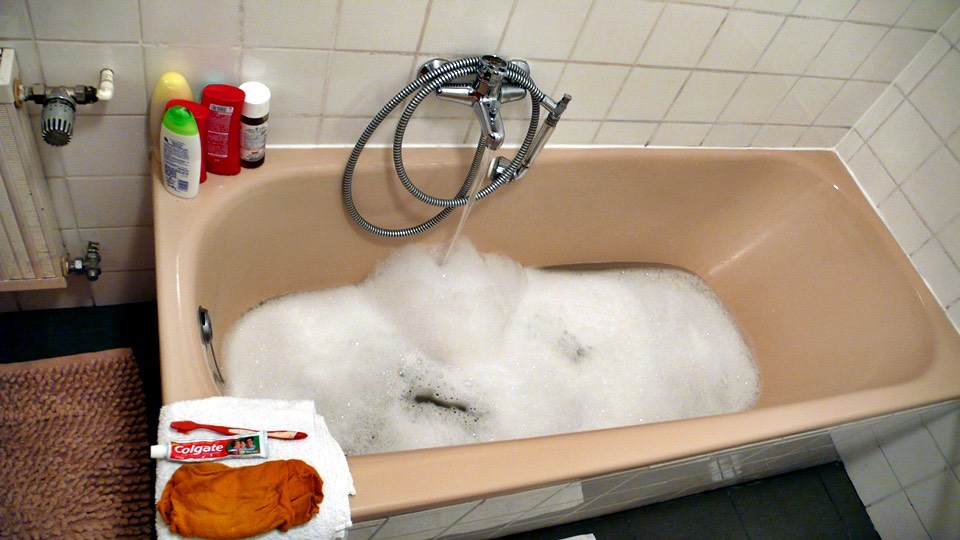 When I took the towel and the toothbrush to the bathroom, the tub was already filled with hot bubbly water.