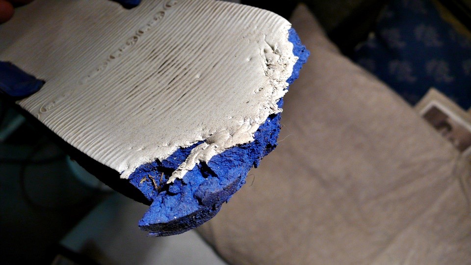 In just one moment, the dog almost chewed the blue and white slipper up.