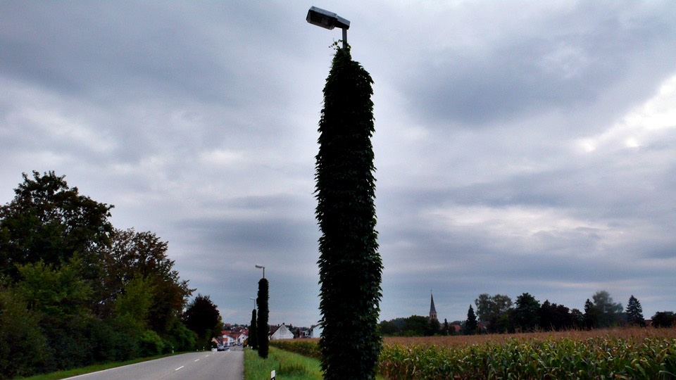 The street lamps here must not be cold; there are lots of Morning Glory plants growing on it.