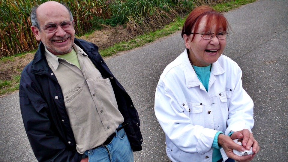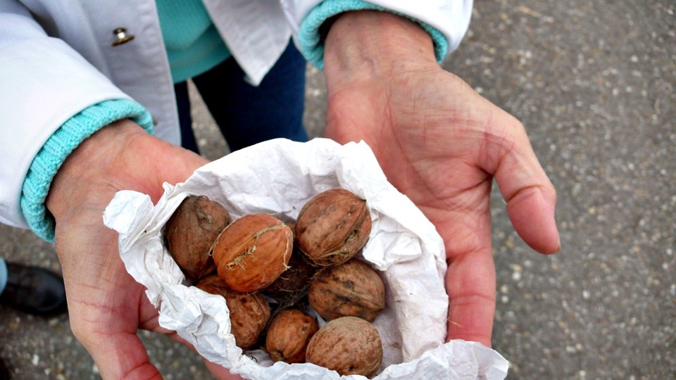 Just then an older couple walking out of the forest, they are picking walnuts while walking, all wrapped up in some napkins.