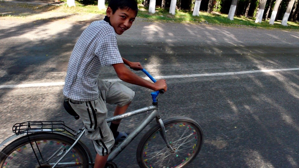 Sometimes kids would run after me for fun. Most of the bikes in Kazakhstan have their wheels