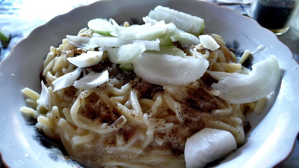 The dinner was white, short and thin noodles seasoned with black pepper and salt topped with sliced onion