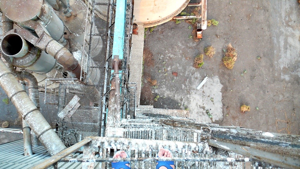 After entering the dirty factory house, we climbed up the steep stairs.