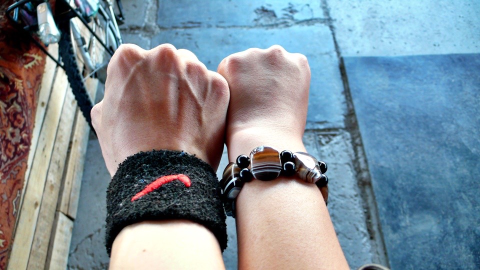 Sartana ran out of the house and put on a swoosh-brand black wristband on my right hand
