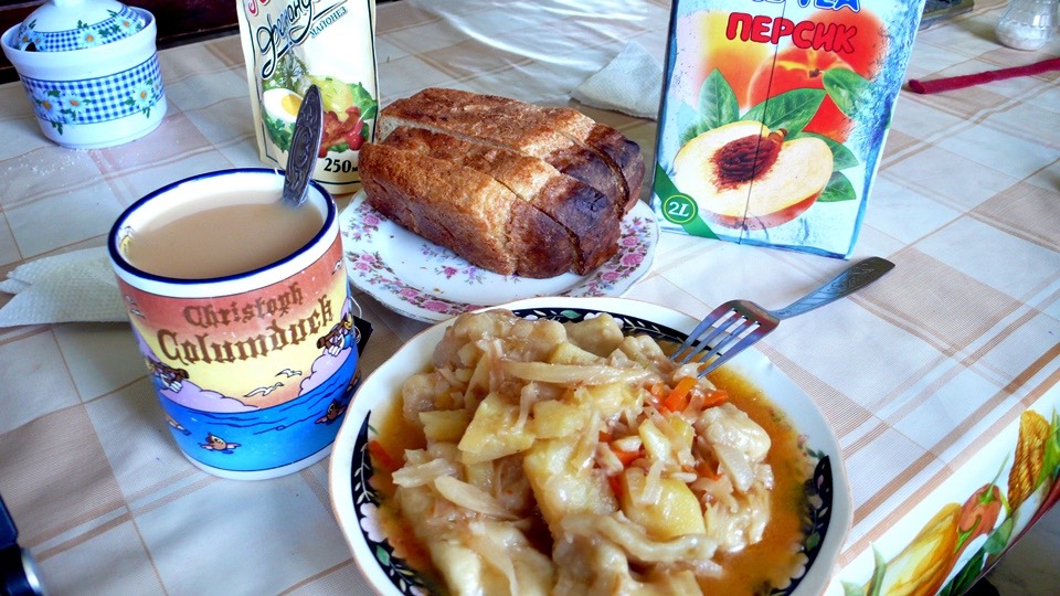 Lunch was curry-flavored stew potato with dough, onions, and carrots in it – very tasty.