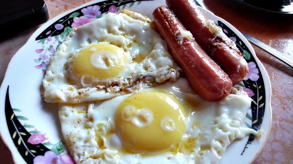 I found a place for lunch, two sunny-side up eggs, two sausages, a cup of milk tea and bread.