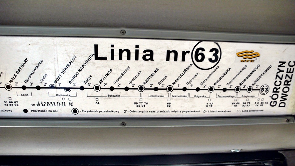 Inside the bus, there is a sign showing which stops this bus makes, and how long it takes to go to each stop.