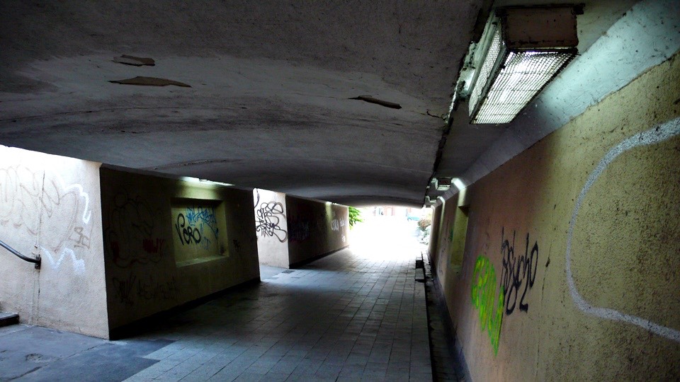 There are some graffiti on the walls of the underground walkway, but in general the whole area is clean.
