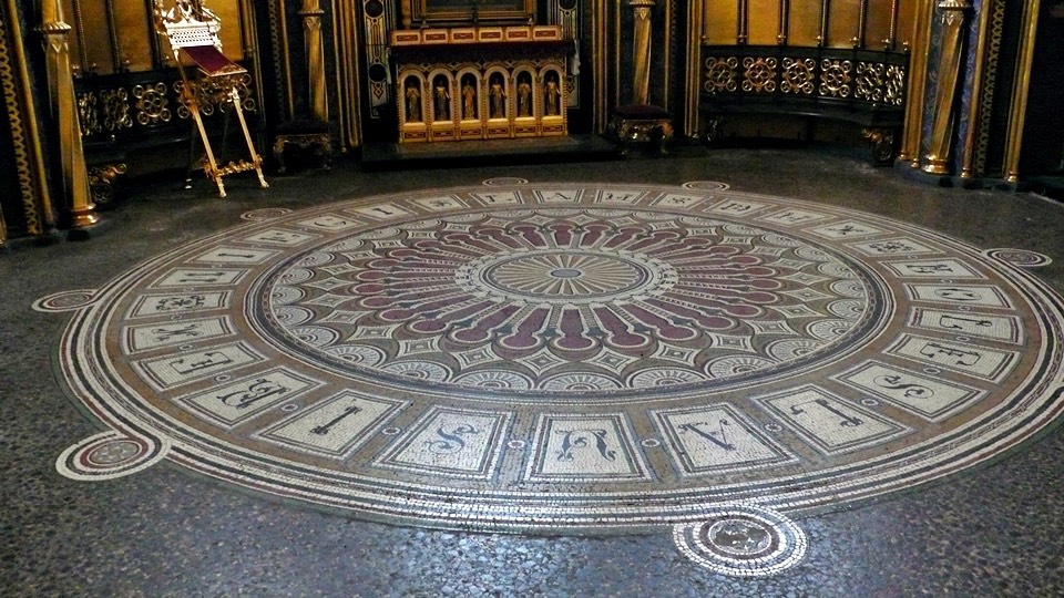 The floor to the gold prayer room, there are letters outside the circle, I am not sure what language it is in.