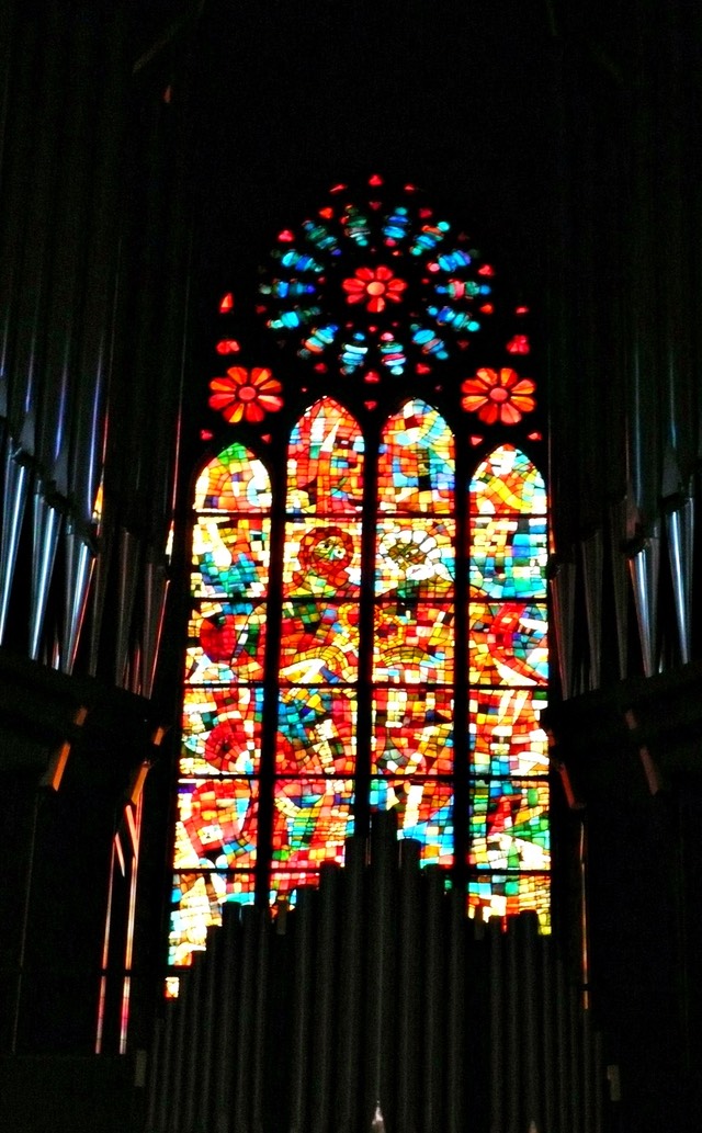 In the front is a glorious gold statue; there is stained glass above.