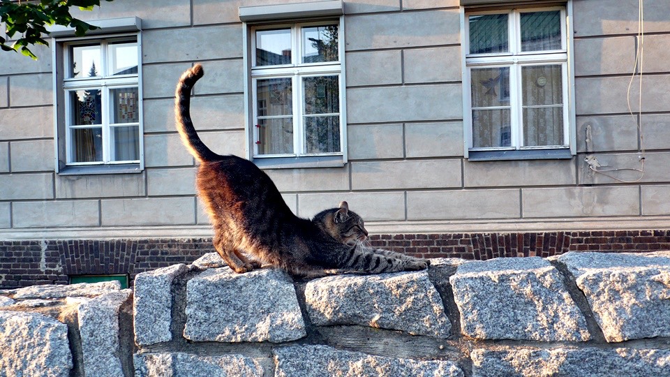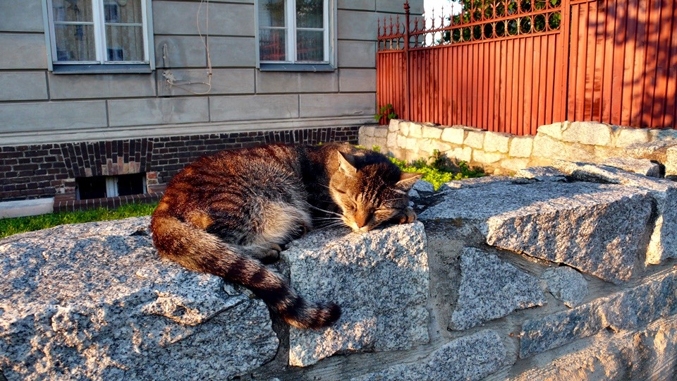 The cats are not as controlled. There are two cats sunning behind the church.