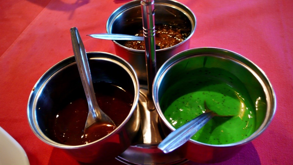 There are three types of seasoning, a green and two brownish ones, one of the seasoning is spicy and delicious.