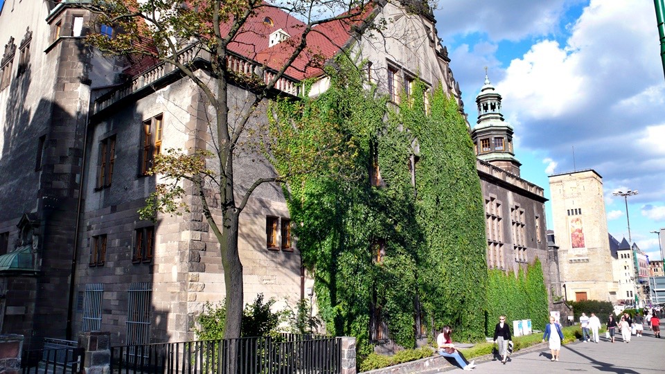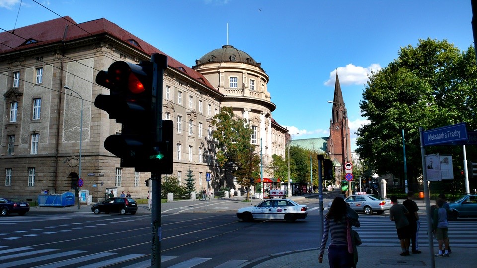 This building next to Adam Mickiewicz’s statue, covered with greeneries, is the auditorium to a university.