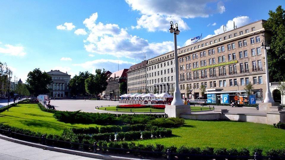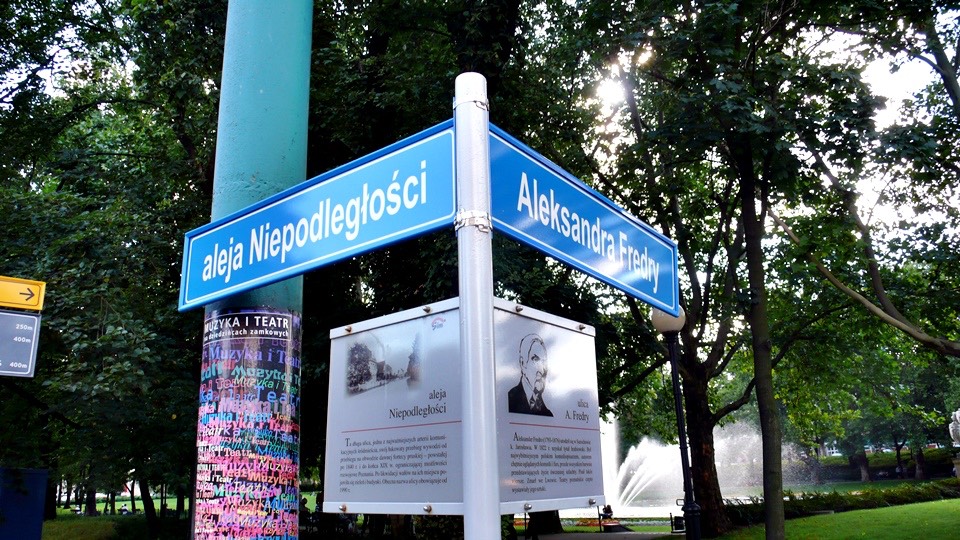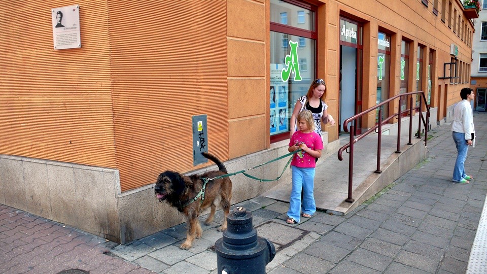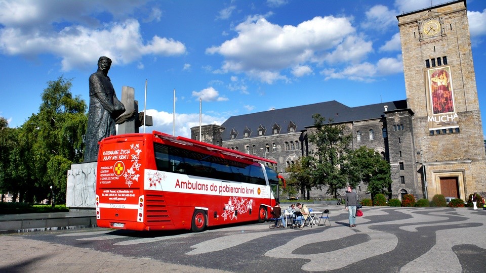 Today there is a red bus with a yellow cross sign on it parked in front of Adam Mickiewicz’s statue.