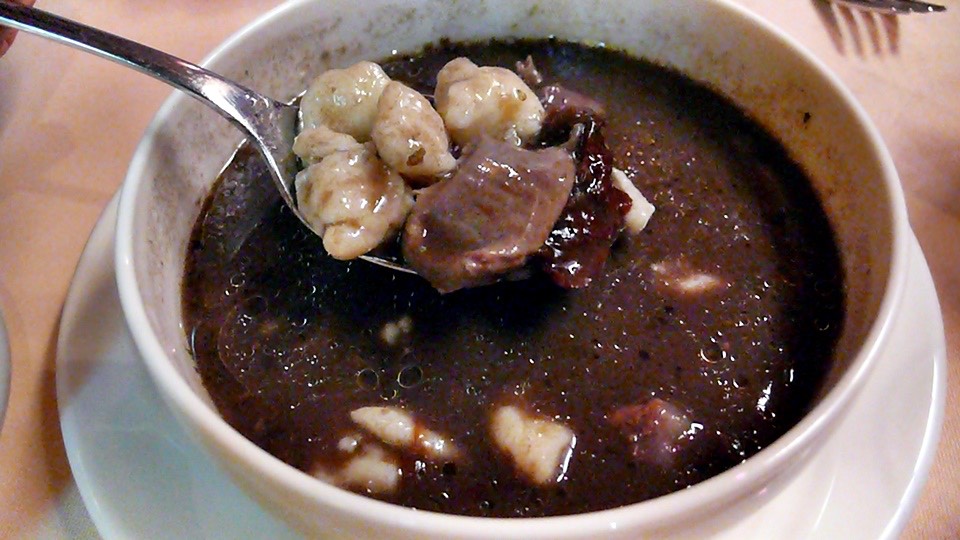 with the addition of duck gizzard and noodle dumplings. The flavor is like any other Polish dish, salty.