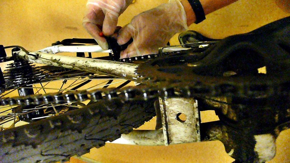 This is much easier to carry than the old tires. Then the new chain, which RST helped to obtain, is added onto the bike.