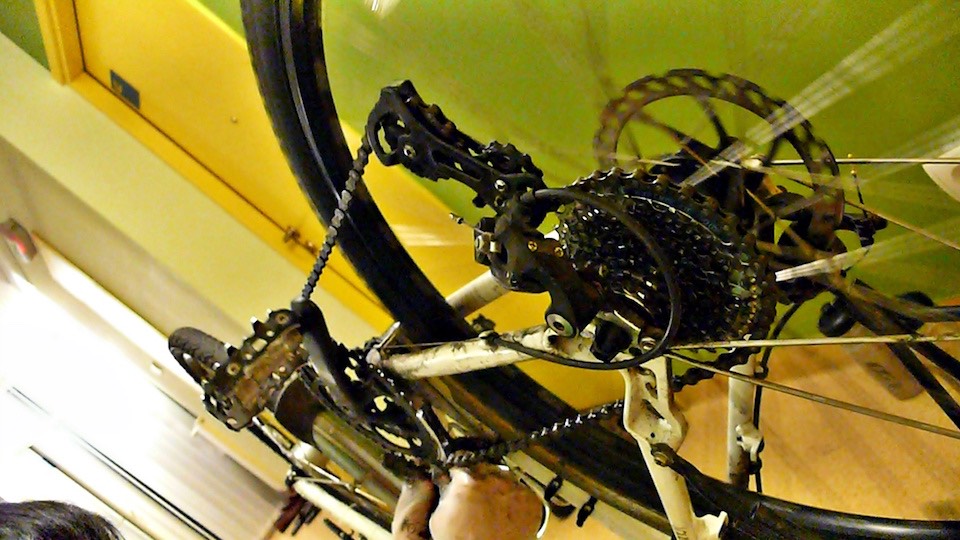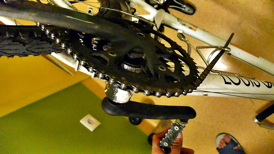 After my meal and ice cream, Gorilla is prepared to change the chain on the bike.