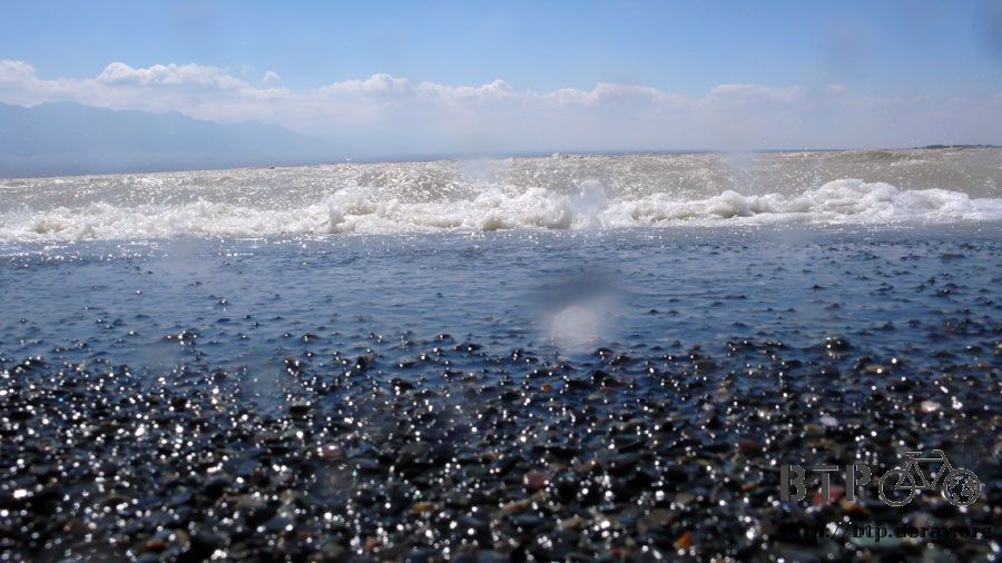 因為風勢很大,所以浪花也很大,不停地往岸邊沖刷,不說這是湖泊的話,看起來還真像是海邊一樣。