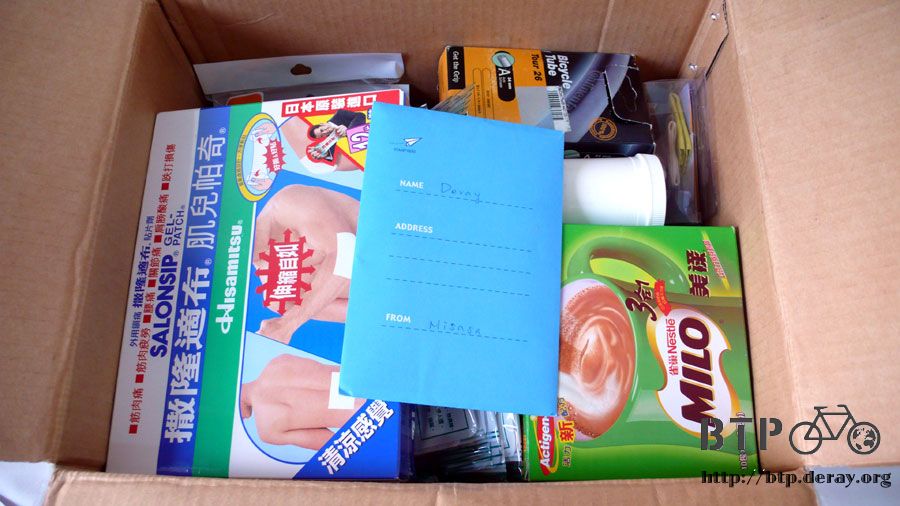回旅館開始拆箱,米莎莎寄了好多東西給我,還有一張小卡片。