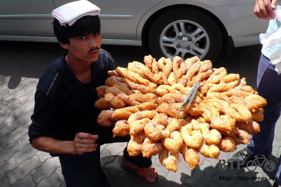 頭上頂著大盤子賣東西的小販立刻引起了我的注意力,叫住了他等他拿下頭上的盤子,賣得是甜的炸麵包,