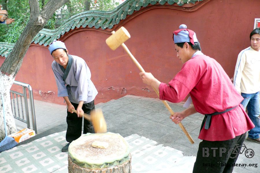 裡面有賣手工搥打的花生糕,兩個人用大錘子將花生糕打的扁扁的,然後再反覆摺疊成小方塊,所以口感是一層一層很酥脆。