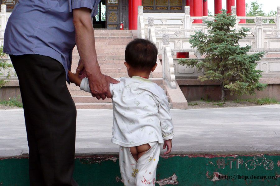 這裡有幾間廟,我都沒進去參觀,在門口拍張照片就好了,意外拍到一個小朋友,中國的小朋友穿的褲子,屁股的部分都是開花的。