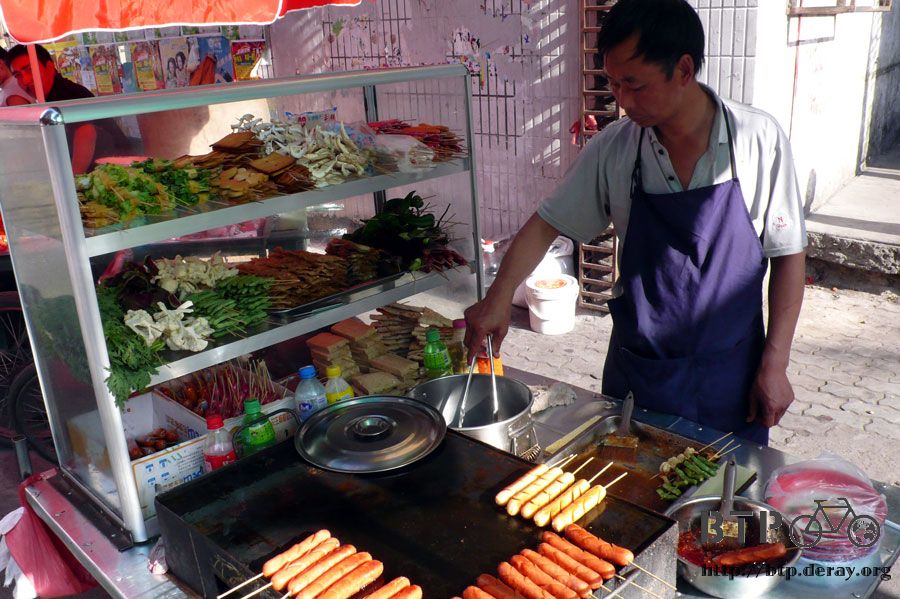 回到招待所之後,在樓下的奇怪鹽酥雞攤販(到現在還不知道我吃得這個到底是什麼)買了一些蔬菜炸串,豆子、花椰菜、金針菇、茄子等等。