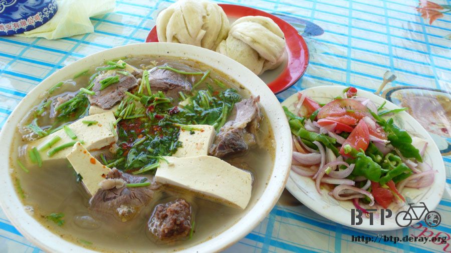 丸子湯裡還放了很多的羊肉片,比起之前吃過的都還豪華,配上窩窩頭就吃得很飽了。