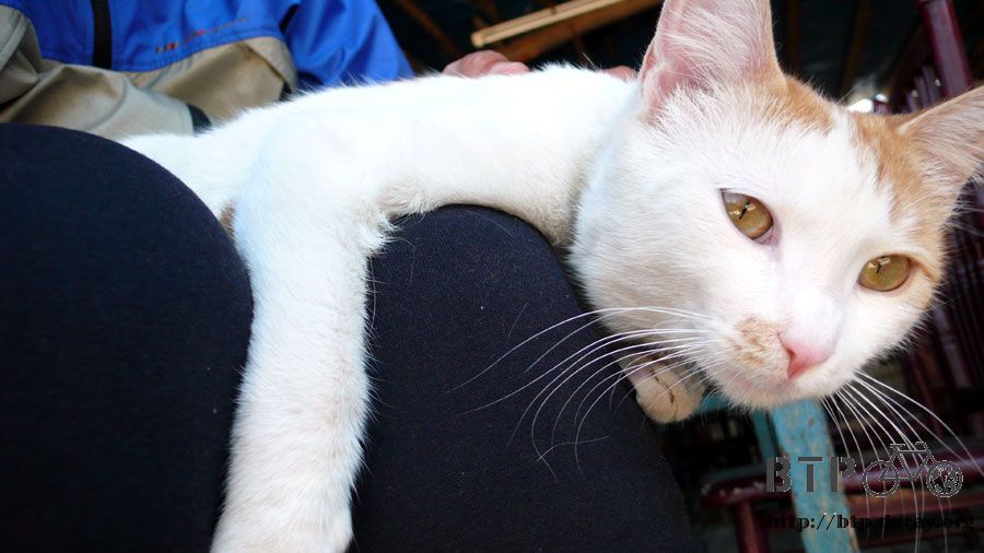 不怕生的貓咪在腳邊繞來繞去,順手將牠抱起來放在大腿上,摸貓咪下巴的地方,沒多久牠就發出呼嚕呼嚕的聲音,表示很舒服的意思。