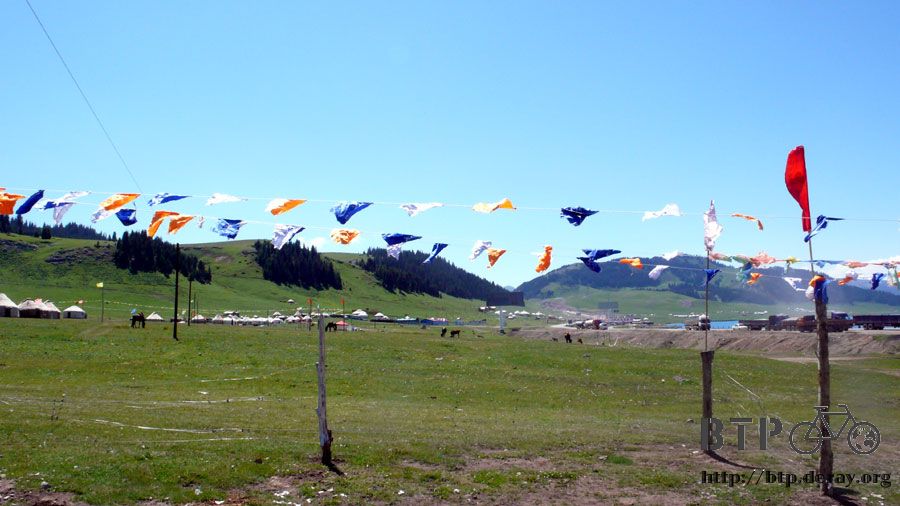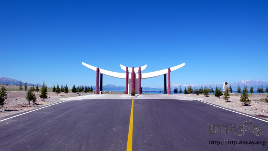 通過這個奇怪的牌坊之後就是賽里木湖,這邊有收票亭,但是騎進去他沒跟我收錢。