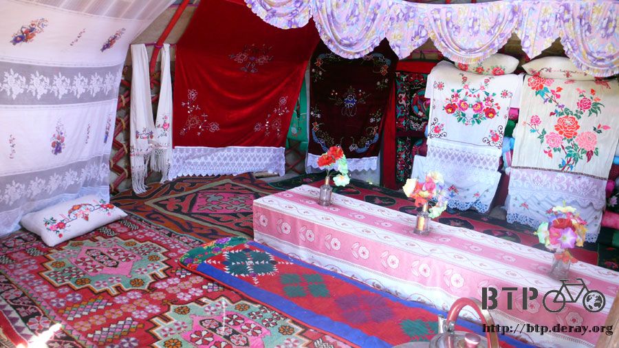 沒有餐桌這種東西,吃飯的地方是在床上,鋪上一塊布,吃饃饃會掉很多屑屑,吃完後整條布包起來就算收拾完畢了。