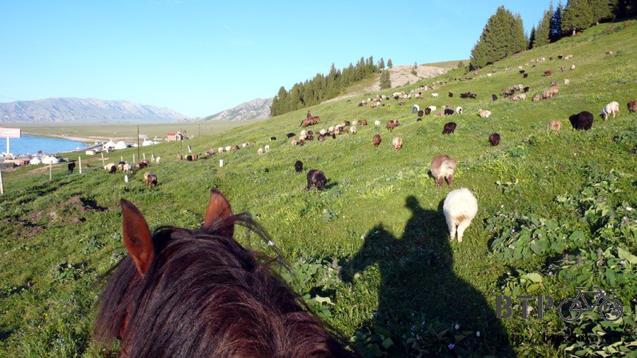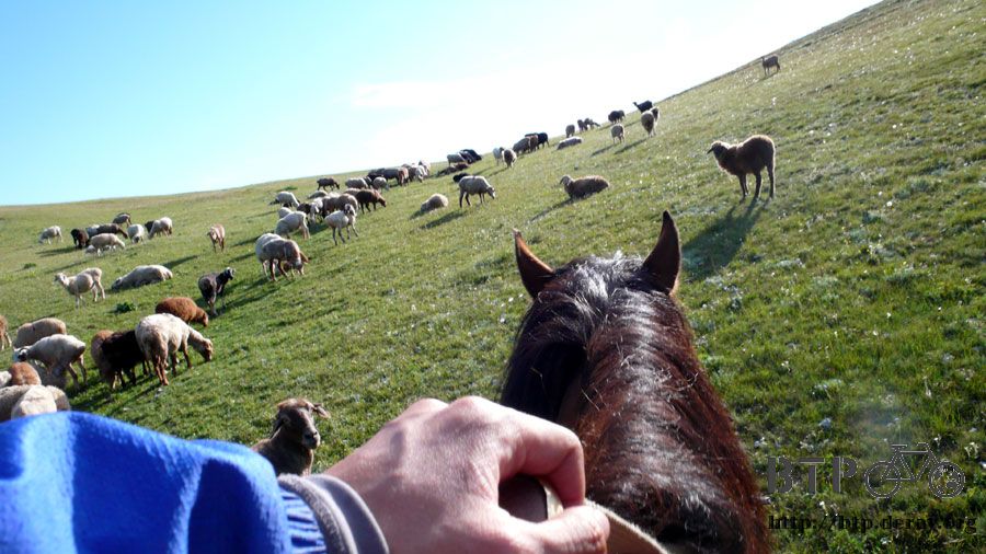 騎著馬爬上山頭,底下就是寬廣的草原,草原上有很多放牧的羊群,我騎著馬經過,感覺自己就是放牧人一樣。