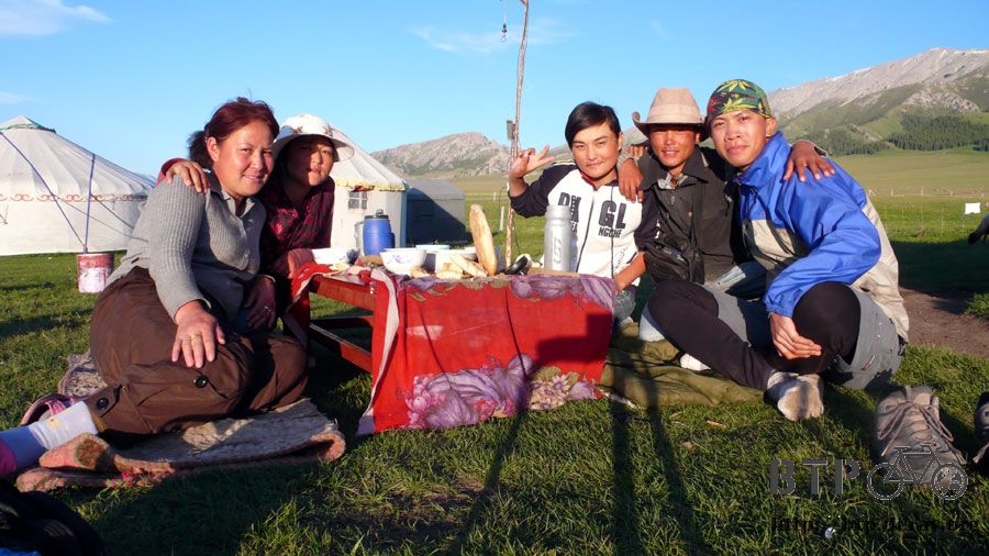 看到我騎著自行車,所有人對我都很友善,這一群客人八個人,玩得很豪華,帳篷裡面各式各樣的餐點、馬奶酒、烤肉、新疆名酒、哈密瓜、羊肉。