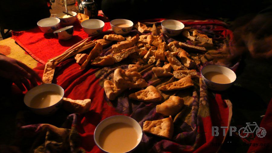 十一點多的深夜才到阿展瑪家的帳篷吃晚餐,喝著熱熱的奶茶,一碗喝完媽媽就會把碗拿過去再重新調配一碗。