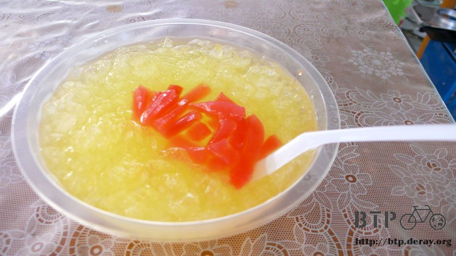 點了一碗鳳梨刨冰,作法跟台灣是完全相反,台灣是用一個大盤子先刨一堆的冰,然後淋上醬料。