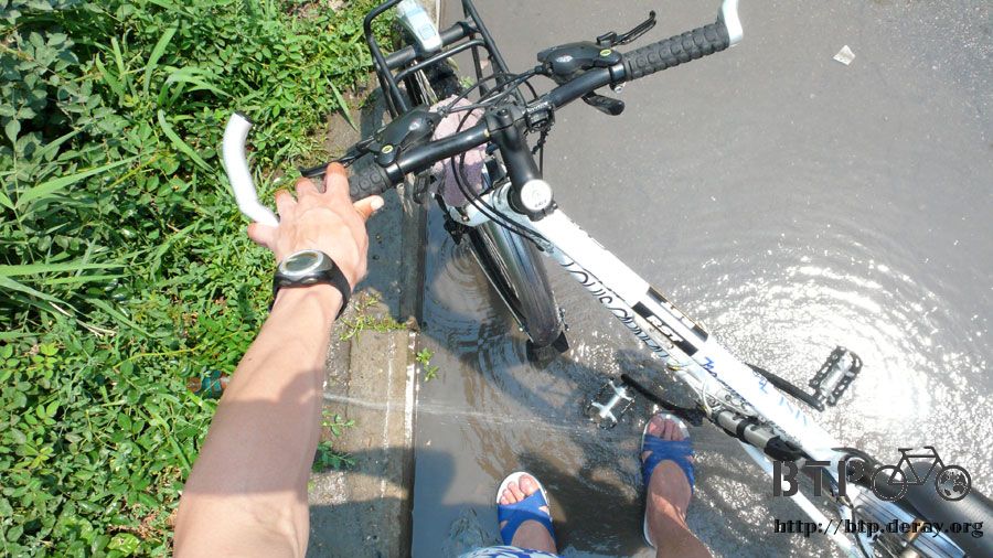 將小多牽到旅館門口好好的將車上的泥沙沖洗乾淨,檢查每一個螺絲有沒有鬆脫、調緊輪胎上的鋼絲、將車胎的氣打飽。